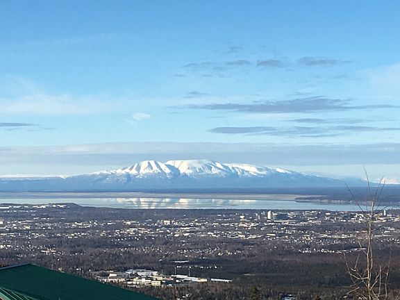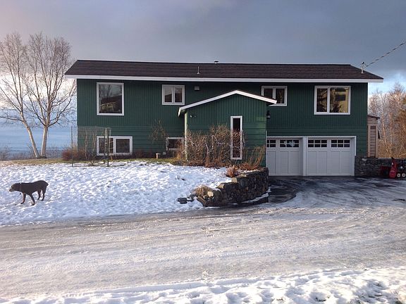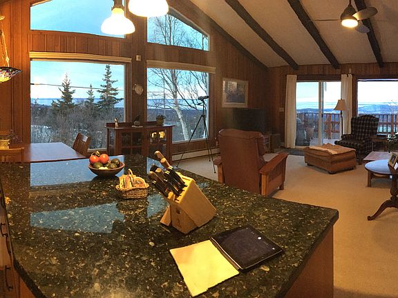Alaskan dream views from this hillside gem. Large arctic entry perfect for guests coming out of the cold. Open concept kitchen, living and dining all enjoy city and Sleeping lady views & vaulted ceilings. Updated kitchen with granite & SS appliances. Huge master bed w/ deck access, walk-in closet & updated bath. 2nd bedroom upstairs w/ full bath. Down boasts family room, bedrm & full bath. Don't miss the greenhouse, 2 woodsheds, 2 storage sheds, fenced garden, new berry bushes and apple trees. Also, new Advantec septic system and high efficiency boiler. 2 car garage has attached storage room! Plans were already drawn up to add mother-in-law apartment and more garage (see photos). Incredible home with planned potential to be more awesome!