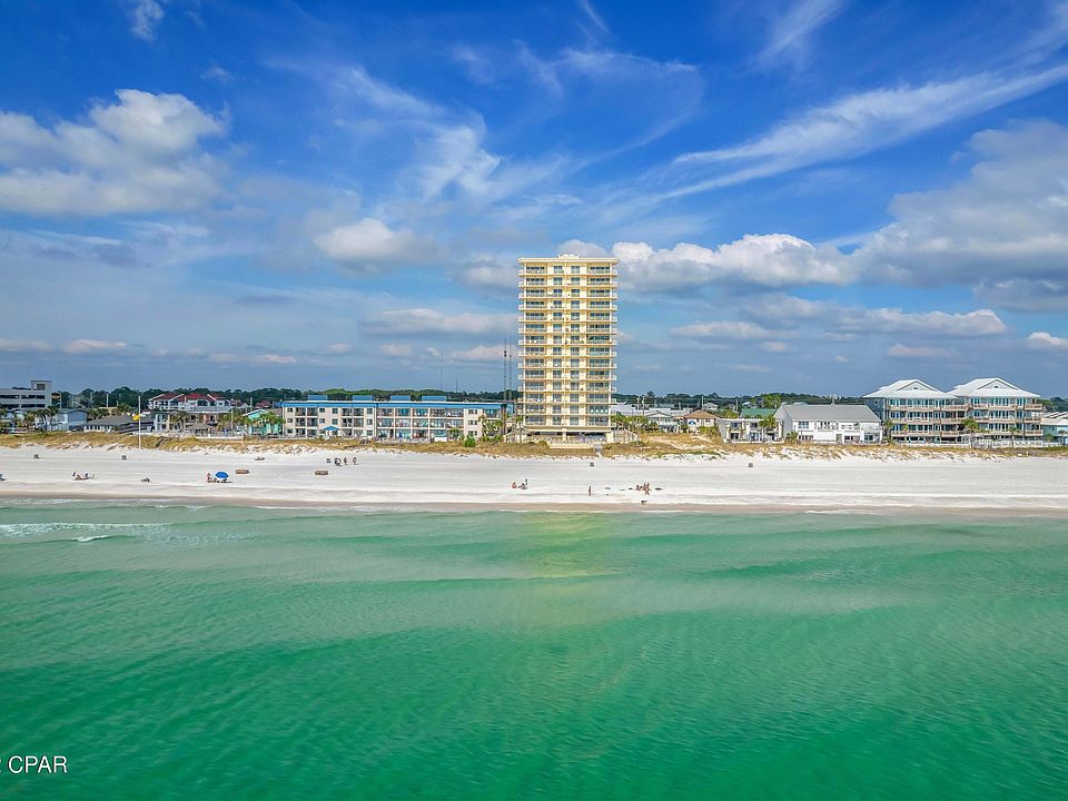 This is your opportunity to own a GULF FRONT condo on the 4th floor of a GATED complex on the beautiful Panama City Beaches. With only 14 floors and 2 units on each floor, you will enjoy the peace and quiet while watching the waves crash on the beach. You will also see the gorgeous views of the ''sun dropping into the ocean'' at SUNSET! The Master Bedroom is waterfront and separated from the other ''sleeping'' rooms. It has a large attached bathroom with a tub, shower, and double vanities with sinks ---as well as a separate toilet area. The main Living Room has plenty of room with shelves on one wall and a separate dining area- The kitchen has a large pantry and a breakfast bar with plenty of extra room for a table and chairs. If you want a very nice home or investment, this is it!