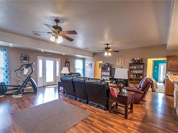 Gorgeous home with awesome 7 ft covered full wrap around porch on 20 acres MOL that is totally fenced and cross fenced with electric gated entrance with a mix of pasture and trees. Home features beautiful stone construction with a very open concept. Very energy efficient with 6 in spray foam insulation and ceiling fans thru out, beautiful kitchen, and huge laundry room with lots of storage. 30X40 detached garage with full bathroom and safe room, a horse barn with 6 horse stalls, tac room, a wash station and a feed and hay storage with concrete floor. COME TAKE A LOOK AT THIS GREAT PROPERTY TODAY!