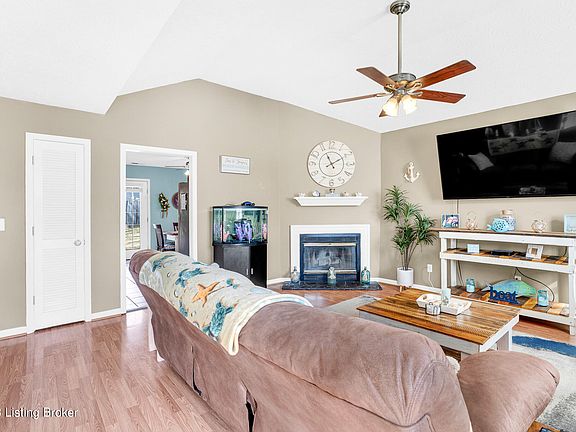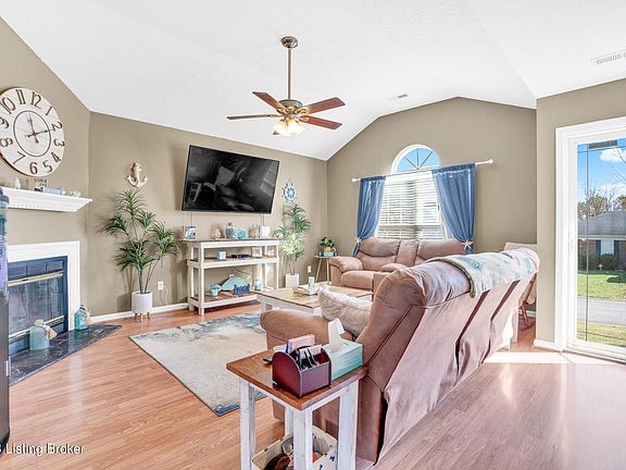 Welcome to this Vinyl, 3 BR, 2BA, 1 Story home, just minutes from I-265. Enter thru decorative glass front door into the spacious Living room complete with vaulted ceilings, fireplace with marble hearth, nearly new laminate wood floors, & ceiling fan. Kitchen boasts tiled floors, recessed lights, lots of counter & cabinet space & Stainless Steel Appliances. Very spacious laundry room off kitchen has additional cabinets for storage. Access the back deck from kitchen for entertaining. Hall bath has tile floors & an updated vanity & lights. Large Primary Bedroom has beautiful trey ceilings, private full bath with shower. Bedroom 2 and 3 are also great size with double door closets. Fenced in back yard with a large deck, shade tree & a storage shed. Concrete drive. located On a Cul-de-sac.