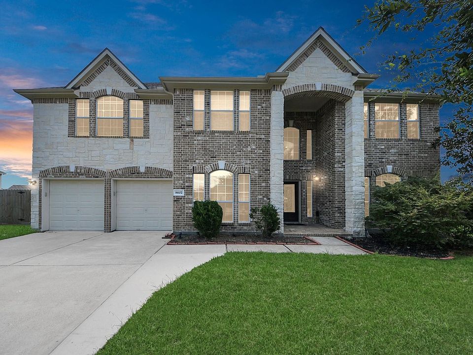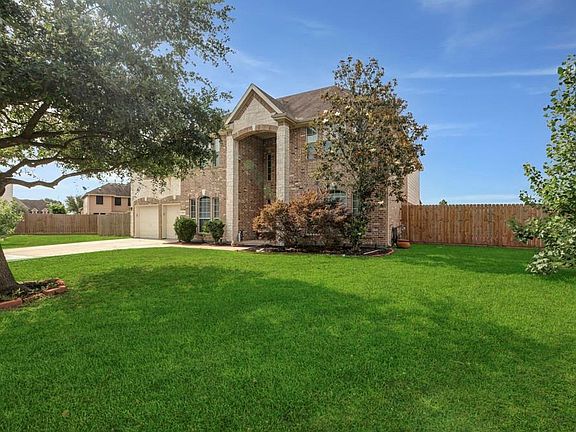 This beautiful home sits on an oversized lot, offering ample space for outdoor activities. Its brick exterior and mature landscaping provide inviting curb appeal. Upon entering, the vaulted ceilings and spacious layout create a bright and airy atmosphere. Beautiful flooring and abundant light throughout the home add a touch of elegance and warmth. The kitchen boasts modern appliances and generous counter space, with an adjacent dining area and attached seating area perfect for entertaining. Upstairs you'll discover a home gym (equipment negotiable) and theater room. The primary bedroom is a comfortable retreat. The fenced backyard and covered patio offer privacy with a well-maintained lawn. Trampoline and storage shed stay! Upgrades include new roof 6/25, water heater and upstairs a/c 2024, fresh interior paint, and an epoxy-coated garage floor. Living room draperies are negotiable. Located in Barbers Hill ISD, low taxes, and close to IH-10. Schedule your showing today!