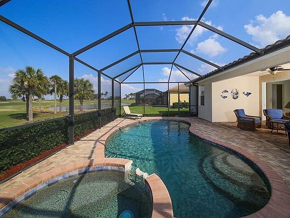 NOW TURN KEY FURNISHED!!! Remarkable value! Welcome home to this sought after Tivoli model with an open concept floor plan featuring a neutral palate so you can make it your own. Relax on your private lanai with a heated pool and spa. Situated on a maintenance free lot with views of the third hole on Estuary and a tranquil lake view. This home includes an equity golf membership in the renowned 27-hole Arthur Hills Designed championship golf course and Clubhouse. Additional features include, guest bedroom with en-suite, upgraded stone elevation, granite countertops, center island, Stainless Steel appliances, crown molding,ceiling fans, three car attached garage, brick-paved driveway and lanai, tile roof and tile throughout the main living area. In addition to world class golfing, River Strand offers 8 HAR-TRU lighted tennis courts, pickle ball courts, and a half court basketball court. There are two main pools, a poolside tiki bar, sand "beach", resistance pool, and 2 fitness centers, one with a separate aerobics room. There is a restaurant in the clubhouse for casual after-golf dining or gourmet evening meals. River Strand is within 1 mile of I-75 & minutes away from world class beaches and UTC mall. All buyers must pay a $2500 Capital Contribution at closing. $200 Golf membership transfer fee. $500 food minimum per year. Taxes include CDD. Just bring your toothbrush!! Make sure you check out the virtual tour button to experience the "Riverstrand Lifestyle"!!