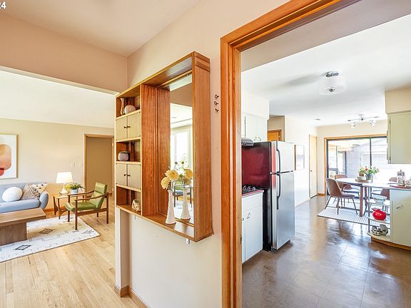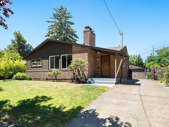 Discover this captivating mid-century modern gem in the Portsmouth Neighborhood of North Portland. This exquisite home was built by local MCM builder Russell Hieder who built a number of homes in the Portsmouth area. Upon entering the home, you will notice a beautiful wall of windows drenching the space in natural light, a stylish tray ceiling, pristine hardwood floors, and warm original wood built-ins throughout the entire home that blend seamlessly. The jaw dropping asymmetrical corner fireplace with floating slate hearth and floor to ceiling Roman stone work will definitely grab your attention! As you move throughout the home, you will notice mid-century modern details are in abundance! All three generously sized bedrooms on the main floor have gorgeous original custom oak built-in closets with a unique shoe ledge and hidden dresser drawers, they are highly functional and beautifully maintained. The Kitchen boasts the original flat-front cabinetry, period metal pulls, rounded end cabinet and a very functional layout for cooking, hosting or gathering. You will love the vintage bathroom with turquoise tiles, boomerang countertop with stainless steel trim and retro apron-front tub. The lower level of the home invites you to step back in time with a dreamy living space boasting a vintage built-in bar and exposed brick fireplace. The lower level contains an abundance of flex space which could be used as an office, artist studio, game room or crafting area. You will also find a fourth bedroom, another bathroom and a laundry room that doubles as a full kitchen with everything you need. The lower level also has a separate exterior entrance giving endless possibilities for multi-generational living or rental income. This gem is all topped off with a generous backyard, covered patio, and mature landscaping. You will find ultimate convenience with close proximity to shopping, New Seasons, cafes, and just adjacent to the St. Johns neighborhood! A gem in a supreme location!!