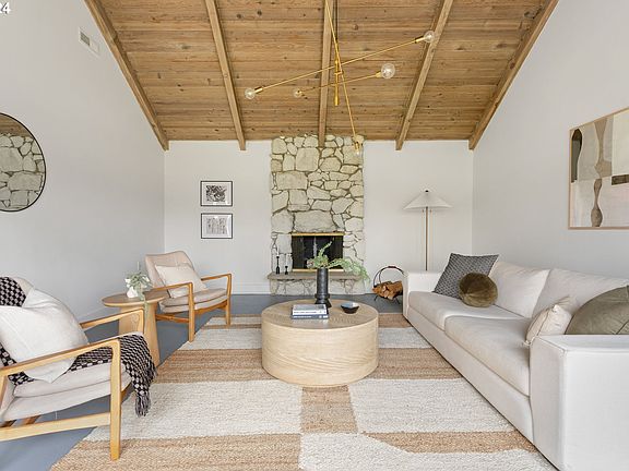 Nestled on a spacious corner lot, this captivating Mid Century Modern ranch exudes charm with its expansive front and back yards. Sunlight floods the dining and living spaces through large south-facing windows, creating a bright and inviting atmosphere. The vaulted wood tongue and groove ceilings, along with a wood-burning fireplace, create a warm and cozy ambiance. The bright and airy kitchen features stainless steel appliances, an eat-in bar nook, and a sliding glass door that seamlessly connects to the backyard. Elegant hardwood floors grace the dining room, hallway, and all three bedrooms, while the living room boasts painted concrete floors, and the kitchen and bathroom showcase tile. Discover the convenience of a spacious basement, for laundry facilities, additional storage, or potential living space. Stay comfortable year-round with gas heating and the added luxury of AC. Ample off-street parking is provided by a driveway, one-car garage, and a dedicated RV driveway. This delightful Mid Century Modern home not only offers comfort and style, but is also conveniently located near Rocky Butte park.