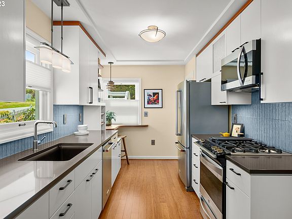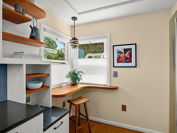 Impeccably well-maintained 3 bed, 2 bath home filled with natural light, modernized kitchen, high efficiency windows, hardwood floors, built ins, arched doorways, wood burning fireplace, tall ceilings and so much more! This kitchen has been tastefully renovated with quartz countertops, custom lighting, high end stainless steel appliances, along with ample counter and storage space. Downstairs, the laundry area is thoughtfully organized with a sink, cabinets, and plenty of room to fold clothes. Abundant storage is available for bikes, hobbies, seasonal items. This meticulously landscaped yard boasts vibrant seasonal foliage, well-established plants, and a patio with delightful window views. Situated within walking distance of exceptional schools, Multnomah Village, shops, parks--all with quick access to highways, and downtown. The roof was replaced in 2020, new AC installed in 2022, plumbing has been updated, basement waterproofed, new interior & exterior paint. (Possible ADU options in basement) [Home Energy Score = 2. HES Report at https://rpt.greenbuildingregistry.com/hes/OR10218843]