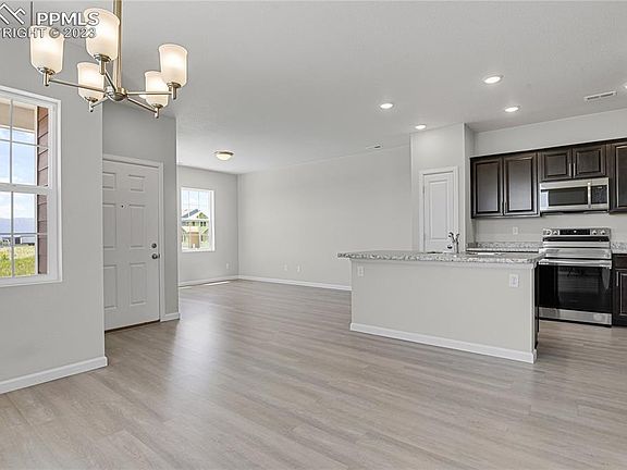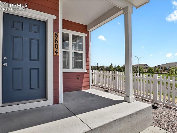 Beautiful views of Pikes Peak, bright corner lot. Low maintenance townhome in the master planned community of Wolf Ranch. This corner unit townhome features a fully fenced outdoor patio, 9 ft. ceilings on the main, over sized 2 car garage, storage closet, large center island in the kitchen, Samsung stainless steel appliances, separate living and dining room, LVP flooring on the main level, upper hallway, baths, and laundry room. Upstairs also features 3 bedrooms with large walk in closets, and the laundry room with cabinets and a linen closet. Enjoy all Wolf Ranch has to offer such as the community pool, dog park, walking/biking trails, several parks, community events, and even paddle boarding and fishing at Wolf Lake. This home is a must see with views from every room! HOA dues include homeowners insurance, snow removal, trash, pool, all exterior maintenance, and landscaping.