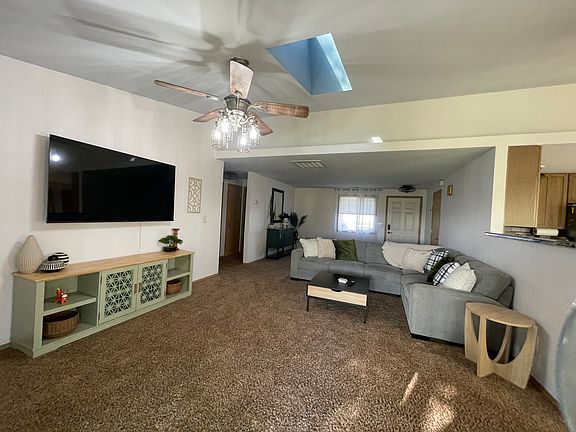 This home features a bright, open layout with granite countertops in the kitchen and modern appliances throughout. Each bedroom is generously sized and includes large closets, offering plenty of storage space. The large living room is perfect for relaxing or entertaining, with a skylight that brings in natural light and a sliding glass door that opens to the backyard. The kitchen is well-equipped with modern appliances, ample cabinet space, and granite countertops, great for hosting or enjoying a cozy breakfast at the breakfast bar. The home also includes a laundry room with washer and dryer, and a two-car attached garage.