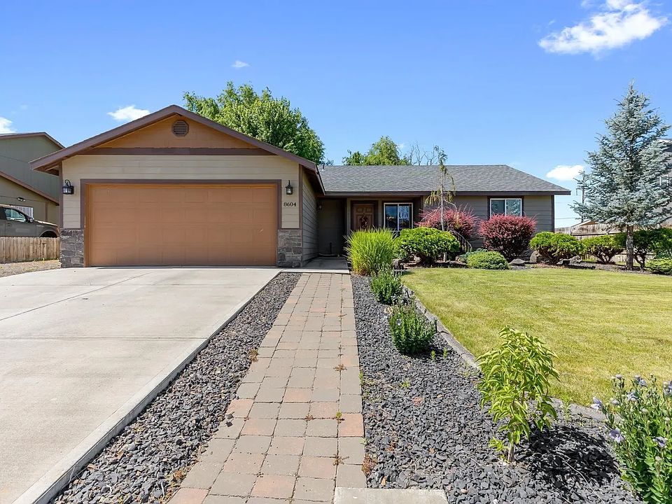 Outside, you'll find a covered patio with plenty of room for outdoor furniture perfect for lounging, barbecuing, or enjoying the warm Tri-City evenings. The fully fenced backyard offers beautiful views of the trees and walking trail behind the home, as well as scenic sunsets and hillside views. The backyard is nearly twice the size of a typical yard in this neighborhood, providing plenty of room to run and play. There's also additional gravel parking next to the driveway, ideal for parking a boat, trailer, or RV off the street.