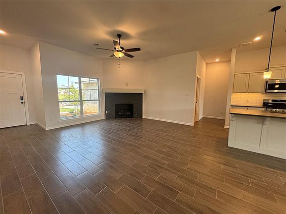 This thoughtfully designed single-story home offers a spacious and functional layout with four true bedrooms, two full bathrooms, and an open-concept living area that seamlessly connects the kitchen, dining, and living spaces. At the heart of the home, the kitchen features a large center island, quartz countertops, soft-close cabinetry, Samsung appliances, under-cabinet lighting, and a walk-in pantry. The open layout flows into the dining area and living room, creating the perfect space for daily living and entertaining. A striking fireplace adds warmth and character to the main living area, while wood-look tile flooring throughout provides durability and style. The primary suite is privately located at the rear of the home and includes tray ceilings, a spa-like bath with an oversized tiled shower, soaking tub, dual vanities, and dual walk-in closets. Three additional bedrooms are grouped together at the front of the home, along with a full bath offering convenient access for guests or household members. One of the standout features of this home is the oversized covered back patio, ideal for outdoor dining, relaxation, or hosting gatherings year-round. Additional highlights include a separate utility room, ample storage, and a two-car garage with direct entry to the home. Built with long-term value in mind, this home includes a pre-piered foundation, tornado safety straps, radiant barrier decking, Schluter shower system, Uponor PEX plumbing, 16" on-center framing, a Navien tankless water heater, and Low-E Thermalpane windows for increased energy efficiency and peace of mind. Located in a growing northwest Oklahoma City neighborhood near the Kilpatrick Turnpike, I-40, I-44, and NW Expressway, this home offers convenient access to shopping, dining, parks, and schools. Schedule your showing today! This home combines high-end finishes, quality construction, and smart design all in one package.