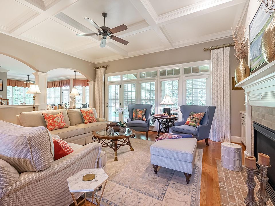 - Bathtub/Shower Combination, Bookcases, Coffered Ceiling(s), Double Vanity, Eat-in Kitchen, Entrance Foyer, Granite Counters, High Ceilings, Pantry, Master Downstairs, Separate Shower, Smooth Ceilings, Walk-In Closet(s), Walk-In Shower, Whirlpool Tub