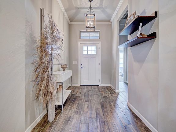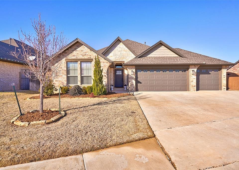 This home welcomes you with a lovely bright foyer that leads you into a beautiful great room with gorgeous wood tile floors and large windows that flood the home with natural lighting. Enjoy entertaining in the gracious open kitchen that includes a large dining area. Gorgeous countertops, gas range, stainless steel appliances, pantry and island with breakfast bar are just a few items featured in this amazing kitchen. Relax in the owner's suite with separate vanities, frameless walk in shower and large closet. Off the entry and leading into the utility you will find a well placed mud bench that is a perfect drop zone. Both utility and mud area have loads of storage. Step out back and you will find an amazing covered patio with extended patio a perfect place to entertain. Roof was put on in 2023, extended patio and storm door on back door are lovely additions you will find. Storm shelter in garage in floor of the 3rd bay area. Enjoy!
