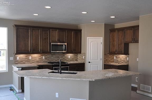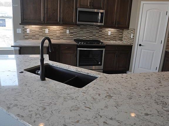Ready Now! Rosewood ranch plan with 2 car garage Banning Lewis Ranch. 4 bedroom, 3 bath home. French door at master bath. Maple Husk cabinets with black glaze and 42" uppers in kitchen. Quartz kitchen counters, stainless steel appliances with gas range. Tile flooring in laundry & baths. Oil rubbed bronze hardware. Air conditioning. Gas fireplace in great room. Finished basement includes 1ft. taller ceilings plus 2 bedrooms, 1 bathroom and recreation room. Exterior living includes 10x10 patio with gas line.