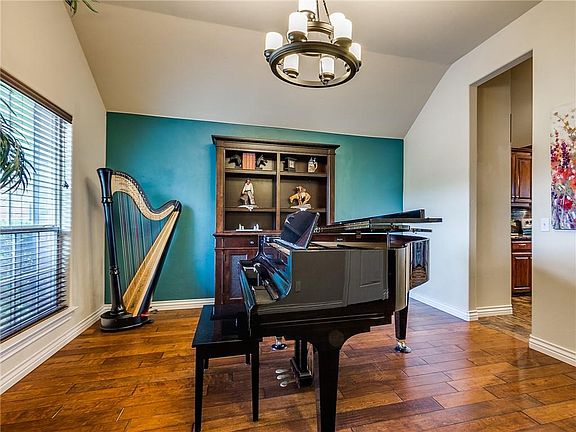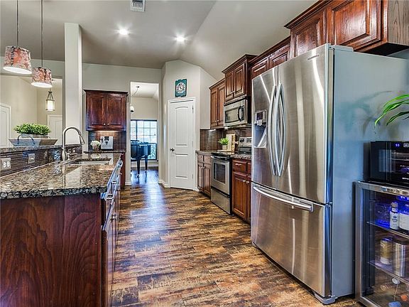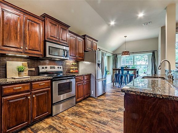 Beautiful 4 bed, 2 bath, 2 dining home on .67 acres +/- with fully fenced, back yard oasis with gorgeous canopy of trees, flag stone pathways, lush landscaping, above ground pool, tree deck, open patio with pavers, wooden bridge, garden area, small vineyard, and detached insulated, air conditioned study. This beauty features open floor plan, formal dining, spacious living room with stacked stone, wood-burning fireplace, kitchen with granite counters, island, large pantry, breakfast bar and eating area, covered patio that overlooks the incredible back yard, full guttering, sprinklers and security system. The Master has long seated window area, walk-in closet, full bath with granite, double vanities, tub and shower. 2nd bath off the hallway with easy access from the living areas and bedrooms. The other 3 bedrooms have ceiling fans and great closet space. This wonderful neighborhood allows workshops and is located about 2 miles from I-35. Call today and come see all this for yourself.