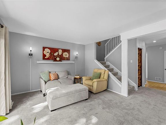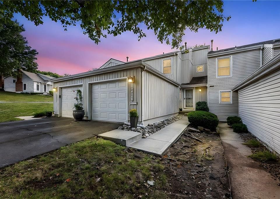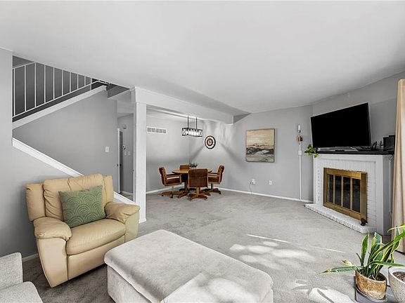 Welcome home to this maintenance provided townhome in the Villages of Overland View. Nestled on mature tree-lined streets, this two-story home sits just one door down from the end unit with a single car driveway and garage with opener. A welcoming front porch with storm door and side light window leads into a tiled foyer with a convenient half bath nearby. The kitchen offers laminate flooring, white appliances including stove, microwave, dishwasher, and refrigerator, and a charming breakfast nook with brick accent walls and backsplash. The dining room adjoins the living room, which features plush carpet, a painted masonry fireplace, and access to a fenced patio with planting beds and a gate to the shared yard. Upstairs, the owner’s suite includes dual mirrored closets and a quartz vanity. The full bath, accessible from both the suite and hallway, boasts tile flooring, a shower, and a second quartz vanity. A spacious second bedroom with plush carpet completes the upper level. The finished lower level adds retro flair with an office nook, laundry/workshop room, family room, a long wet bar with built-in cabinets, and a fall forest mural accent wall. The HOA covers building maintenance, lawn care, snow removal, and more, while amenities include a community pool, clubhouse, and sports court. Conveniently located near highways, shopping, and restaurants, this home combines comfort, character, and low-maintenance living.