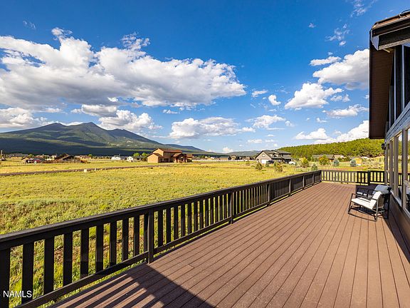 Immerse yourself in tranquility with stunning vistas of the San Francisco Peaks. Seated in a beautiful meadow, the whispering embrace of the surrounding forest creates a captivating environment. This home boasts both a large porch and a stunning back deck, either are perfect for savoring a cup of coffee while basking in the morning sun or unwinding with a glass of wine as the day comes to a close. You and your guests will enjoy time spent around the firepit; just another way to enjoy the beauty of your surroundings.