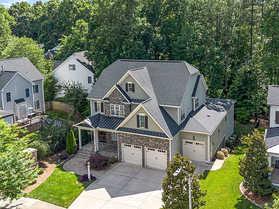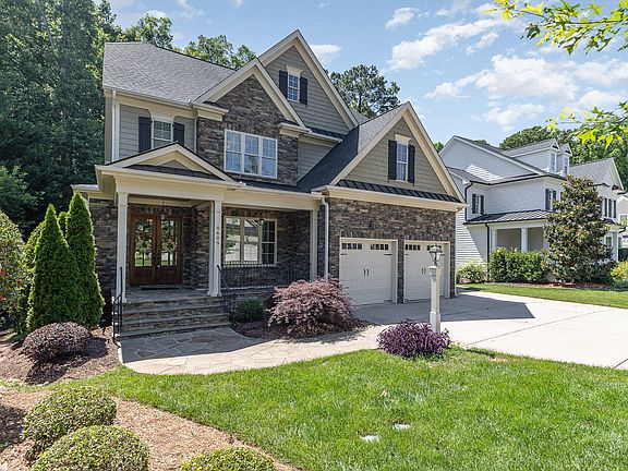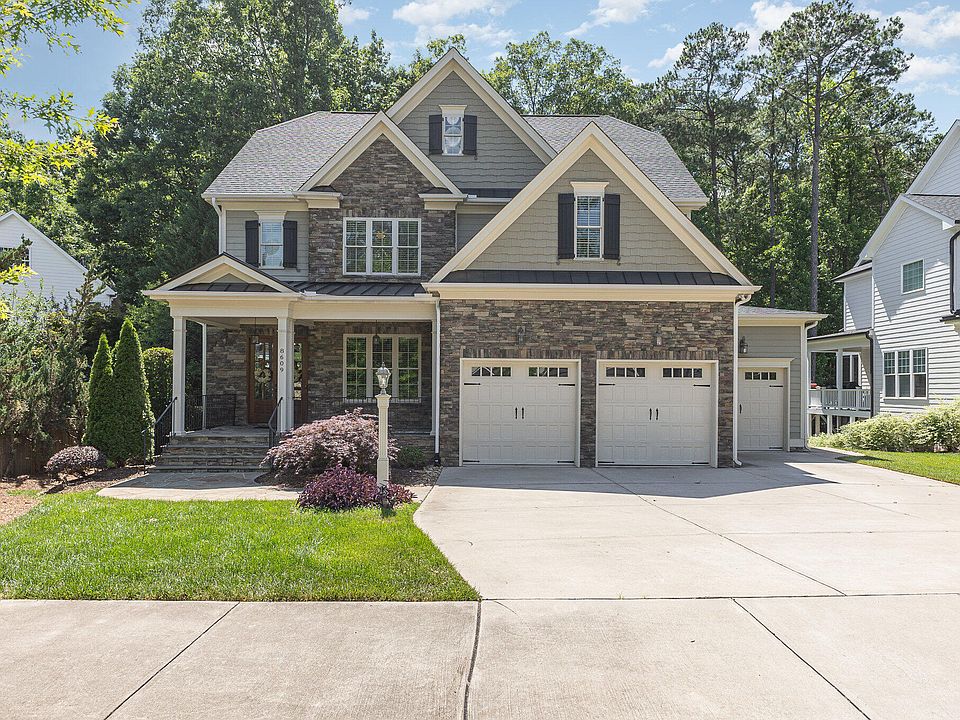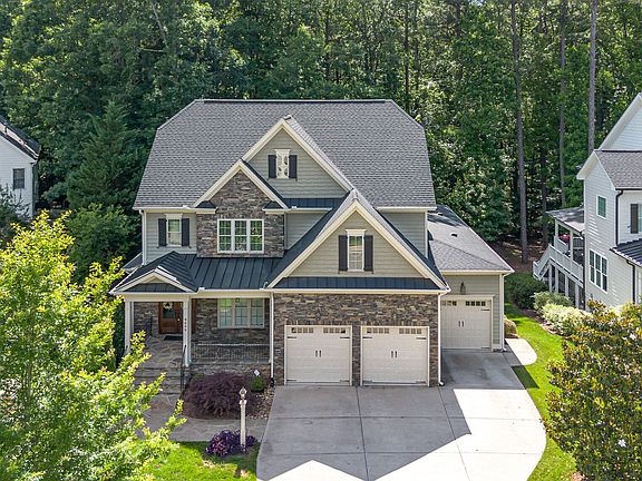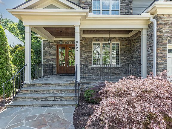 This beautiful home features a finished walk-out basement and a spacious 3-car garage, with an additional tandem space for a 4th car. The entryway welcomes you with a stunning mahogany front door and a flagstone walkway leading to the front porch. The kitchen is a chef's dream, boasting granite countertops, custom cabinets with designer hardware, a large center island with a breakfast bar, and high-quality stainless steel KitchenAid appliances. The dining room showcases an elegant trey ceiling, adding a touch of sophistication to your meals. The family room is cozy and inviting, featuring a custom tile surround fireplace with built-ins, perfect for relaxing or entertaining guests. The master bathroom offers dual vanity sinks, custom cabinets with granite countertops, a garden tub, a separate tile shower, and a private water closet. There are two additional bedrooms, each with its own ensuite full bathroom, providing privacy and convenience. The mudroom features a bench seat and cubbies, ideal for keeping your belongings organized. Other notable features of this home include a tankless water heater, full irrigation system, and a backyard that backs up to the serene woods.
