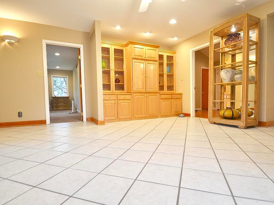 Mid-Century Modern ranch. Open Floor Plan! Privately hidden away behind 6' tall hedge living fence. Amazing 4 bedroom Brick ranch with stone front. Over 3,000 sq ft finished. Updated with an addition, huge great room, Master Bedroom, Master Bath, and 4th bedroom with cathedral ceiling. Kitchen with custom soft close cabinets, bar, bay window, white porcelain tile floor and is open to the great room. The spacious living room has hardwood floor, fireplace, a wall of windows and glass accent wall. This home has 3 full baths and 1 half bath. The Laundry, 4 bedrooms, 2.5 baths are on on the first floor. There is the 3rd full bath in the basement and a Sauna. There's replacement windows, a great deck, fenced back yard and a 2 car garage with storage shed attached. New roof