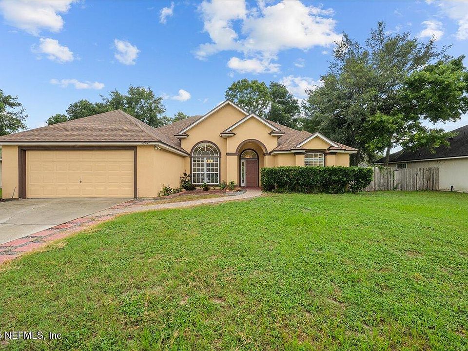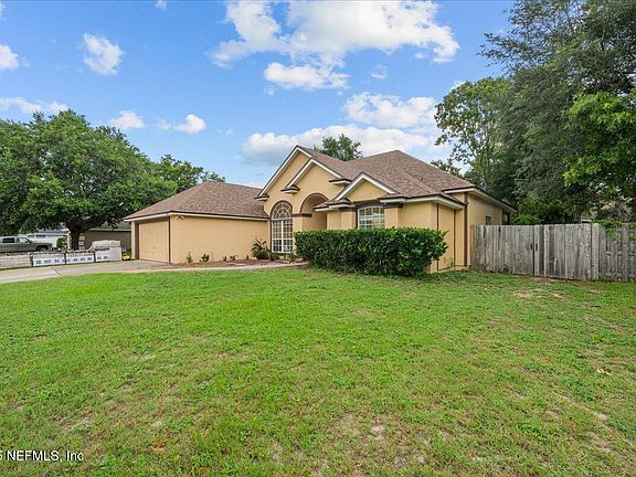 This beautifully updated home features a brand new roof installed in December 2024, showcasing modern upgrades throughout. Enjoy stunning sparkling granite countertops and upgraded cabinets in the kitchen, complemented by new stainless steel appliances. The home boasts travertine tile flooring, newly updated ceiling fans indoors and outdoors, and elegant frameless shower enclosures. Relax by the cozy fireplace or unwind in the Jacuzzi. The master suite offers a Jack and Jill closet, spacious walk-in closets throughout the other bedrooms, and abundant storage space. Additional backyard storage and a fully fenced yard provide privacy and convenience. with tree-lined streets and sidewalks. It's less than a mile to schools, shopping, and dining, and provides easy access to Jacksonville and Georgia.