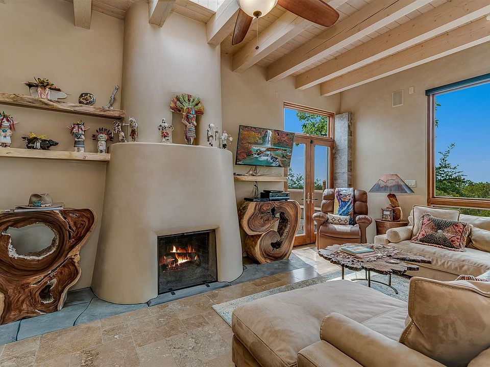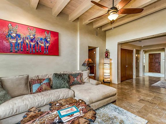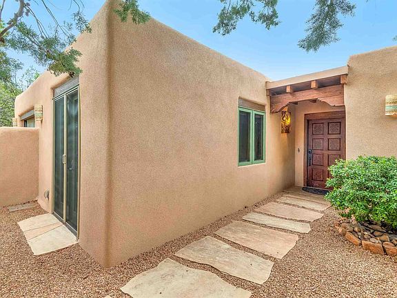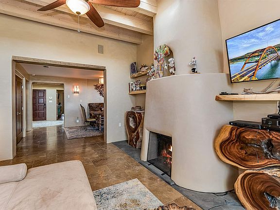 Contemporary 3 bedroom 2 bath freestanding condo in the North Hill Compound. Sweeping views of the Sandia, Ortiz and Jemez mountains. Open concept floor plan. Living room has a dramatic fireplace with an insert for storing firewood. Dining area plus eat-in kitchen. The chef's kitchen is well appointed with granite countertops and a new (2020) Bosch range and microwave. In addition to the two bedrooms is a flex-room for a studio or office. Two private courtyards and an outdoor kiva fireplace extend living and entertaining space into the outdoors. Private location on a cul-de-sac backing to greenspace. One car garage. Just minutes to the Santa Fe Plaza and Canyon Road.