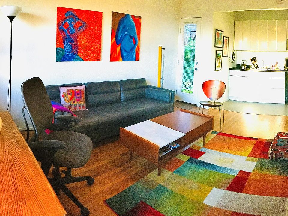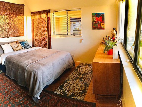 Our beautiful modernist house, an abstractionist step beyond mid-century modern, sits in the Berkeley Hills, just a short drive to SF & Oakland, and in close proximity to UC Berkeley, the magnificent Indian Rock Park, John Hinkel Park, Berkeley Rose Garden, Tilden Park, Lawrence Hall of Science, MSRI, Berkeley Repertory Theatre, BAMPFA (Berkeley Art Museum & Pacific Film Archives)*, the famous Gourmet Ghetto & the Solano Eateries. It is accessible from Downtown & North Berkeley BART stations via car by 10 minutes, and bus by 15 minutes. 35-minutes drive to San Francisco; 20 minutes by BART. (Car parking available at North Berkeley BART station.) Lyft & Uber never more than 7 minutes away! The apartment for rent (and the entire house) is exquisitely designed by Donald Olsen, the famous Berkeley architect who taught at UC Berkeley, and also designed the much-talked-about Wurster Hall, the Dog-like building that houses the Architecture Dept at Cal. It faces West for both spectacular sunsets and breathtaking views of the Bay, the City, and the Golden Gate. The tastefully-furnished suite includes a private living room, bedroom, well-appointed kitchenette, hallway & a full bathroom with a tub. The space A super comfy queen bed, layered in Muji pure-cotton bed linen, awaits you in the bedroom, which also has a full-sized closet with hangers and a smooth West Elm dresser. The kitchenette comes with a mini refrigerator, full size convection-cum-microwave oven, ample shelving, electric range, sink, silverware, plates, bowls, blender, rice-cooker, kettle, cookware, pot-holders etc. The TV in the living room is ready to Chromecast your lineup from Netflix or Amazon Prime. Comfortably catch up on work at the desk & ergonomic chair, while contemplating the famous Berkeley Hills view of the city-by-the-bay and the Golden Gate Bridge... perhaps even observe the casual visit of a deer. Or lounge on the butter-soft leather couch to read a book or play a game from our collection. The hallway has two closets: a full-size open closet and a linen closet with shelves stacked with multiple sets of bed linens, towels of all sizes, first aid kit, and clothes iron. Here's the rental application: Or fill the Zillow Application! *The house was originally designed for Professor Peter Selz, the inimitable connoisseur of art and the founder of BAMPFA! Includes utilities, PG&E, EBMUD (water), high speed (Gigabit) internet, and Recycling & Trash pick up fees. No pets, no smoking. We all love clean air as much as possible especially with the current pandemic, and are super conscientious w.r.t. consumption of water and power in view of the pending ecological crisis. Deposit: $2000