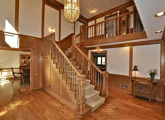 Spectacular lakefront home located in peaceful stable neighborhood in country but close to schools, shopping and major thoroughfares. Gorgeous woodwork, over-sized rooms, built-ins throughout home. Home great for entertaining. Intercom system in all rooms from Kitchen. Spacious eat-in Kitchen featuring a center island with electricity, double oven, oak cabinets, window over sink with view of lake, planning desk. Breakfast Room with French Doors out to Patio overlooking 7 acre lake. Formal Dining Room with hardwood floors, dental crown molding, large window great for memorable family gatherings. Great Room with masonry gas fireplace, built-ins, ornamental wood beams, lots of natural lighting, ceiling fan. Sun Room overlooking lake boasts Hibachi grill with hood that stays with home. Laundry Room with cabinets, folding area, crown molding, tile flooring on main level. Cat walk overlooks Foyer. Master Suite with gorgeous wood tray ceiling, walk-in closet. Sitting Room with French Door out to private Balcony overlooking lake. Exquisite Master Bath with cathedral ceiling, walk-in shower, ceiling fan, tub with track lighting, double sinks. Bedroom Two with built-ins, ceiling fan, large closet. Third Bedroom with built-in desk and television hutch, ceiling fan, large closet. Bedroom Four with built-ins, large closet. Full Bath upper level With double sinks, window. Stunning Office upper level with hardwood floors, built-ins, sky light, window seat. Enormous Family Room in Basement with floor to ceiling masonry gas fireplace, lots natural lighting, ceiling fan, ornamental wood beams. Bar in Basement with built-ins, new refrigerator, sink, tray ceiling, crown molding. Recreation Room with tray ceiling, wainscoting. Pool table can remain with home. Large stamped stone Patio with brick wall offers spectacular views of lake. Gazebo at water's edge of 7 acre lake with electricity and ceiling fan. Enjoy swimming and fishing in Summer then ice skating and ice fishing in Winter.