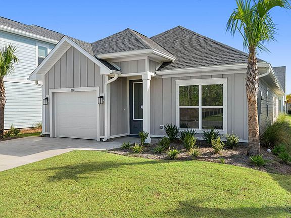 Welcome to 861 Walsonham Drive at Breakfast Point East in Panama City Beach Florida. This home is under construction and situated on an exterior lot at Phase I. This floor plan features three-bedrooms, two full bathrooms with an open concept living area. As you enter this home through the covered entry, you will notice there are two bedrooms situated off the hallway with a shared bathroom. Continuing down the hall you will pass the laundry room and mudroom, both conveniently located across from the garage door. The spacious laundry room features beautiful accent flooring and plenty of space for a sorting and folding station. The grand hallway opens out to the large living space and the kitchen. You will be amazed at the open feel with 9-foot ceilings, numerous large windows flooding the space with natural light, and a center island with bar seating where the conversation can flow with your family or guests as meals are prepared and shared.