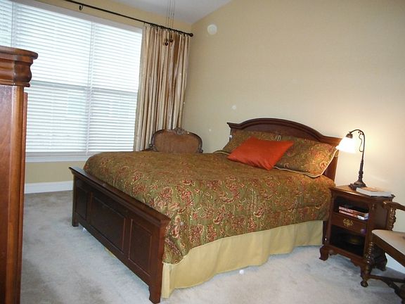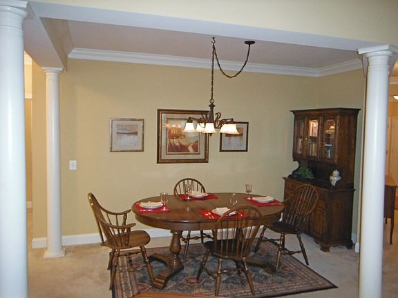 Welcome home to your beautiful spacious top level condo backing to trees. The open floor plan is spacious and offers formal details such as crown molding and decorative pillars. The soaring vaulted and trey ceilings add to the open feel. The kitchen boasts granite counters, ceramic tile floors, birch cabinets and G E appliances. The sun filled rooms each have a ceiling fan. The kitchen opens to the family room with 7 windows and the formal dining room framed by columns. The foyer and front hall open to the formal living room. The master suite has vaulted ceilings and two closets. The master bath has two vanities, a soaking tub and separate shower, along with decorative tile. The second master bedroom has a private bath and walk in closet. Enjoy working from home in your spacious home office. The one car garage offers convenient parking. Enjoy a peaceful community with friendly neighbors convenient to the V R E, shopping and restaurants.