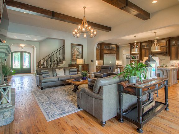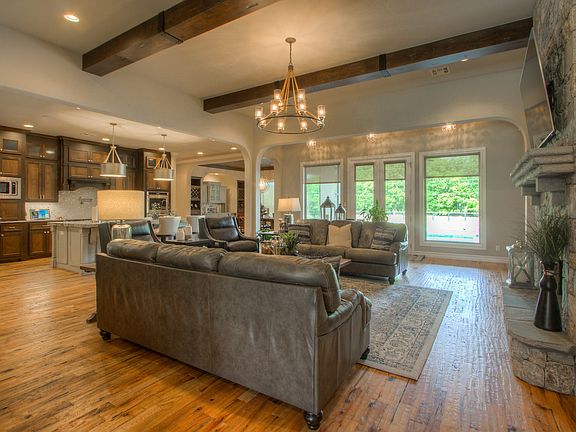 Luxury Estate Near Tulsa Hills on 1.6 acrs m/l. Open-concept kitch, Island, SS App, & large walk-in pantry. FR w/gorgeous wood beams, scraped hardwoods & wall of windows. FD w/built-ins & wood ceiling. Additional rooms include gameroom, Office, Media room & flex room. Access to Dog run, outdoor turf area & dog watering station from flex room. Indoor Safe Room, Whole-Home Generator, mosquito repellant system, pool, lounging deck, swim up bar & fire pit are a few amenities this energy efficient home offers.