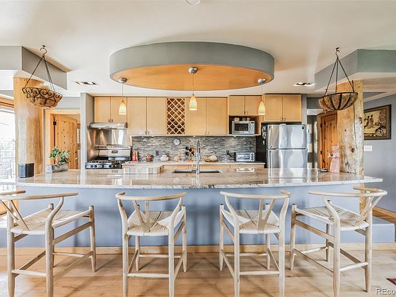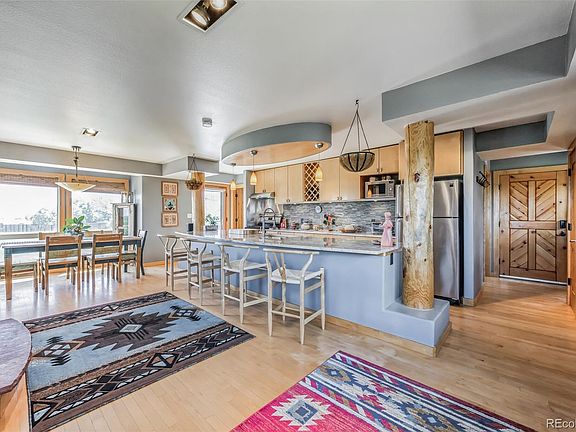 STUNNING 3-bedroom, 3-bathroom rustic contemporary home in Arvada! Nestled on a 1.4-acre lot with breathtaking views of the Flatirons and Standley Lake, the "architect's home" is a custom-built home that maximizes panoramic views on every level and keeps energy efficiency in mind. The main level boasts an open floor plan, highlighted by log pillars, a gas fireplace, and a well-appointed kitchen with granite countertops. The upper-level master suite features panoramic views, a personal office, walk in closet, and a luxurious bathroom with heated floors. The finished walkout basement offers two guest bedrooms and a family/recreation room and a steam shower. Enjoy outdoor living with a deck, hot tub, and fire pit, all surrounded by low-maintenance stucco siding and a metal roof. With owned solar panels, move-in readiness, and a prime location close to Boulder, Denver, and the mountains, this home is a rare find. Don't miss out on this beautiful gem! Home will be move-in ready come August 2nd.