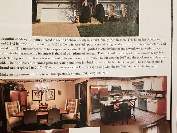*** Oldham County Schools*** **WILL WORK WITH BUYERS AGENT* ***First time on the market *** Beautiful move in ready Pewee Valley Home. Award winning South Oldham schools. The kitchen has granite counter tops, GE Profile stainless steel appliances and a high end stainless steel gas range. Tons of tile and wood flooring throughout. The master bedroom has a walk in closet, updated master bathroom and a window seat with storage. For extra living space the basement is finished with 2 storage closets. The backyard is very private and perfect for entertaining. There is an inground salt water pool with LED lighting and new equipment and newer liner. The pool has an extended patio for seating and there is a paver patio with a firepit. The home sits on a 1/4 acre lot with a 6' wooden fenced backyard and a shed for storage. The hot water tank is new and the roof was replaced about 4 1/2 years ago. Pictures don't do this home justice. Please call now for a showing. 502-500-8991 I will work with the buyer's realtor