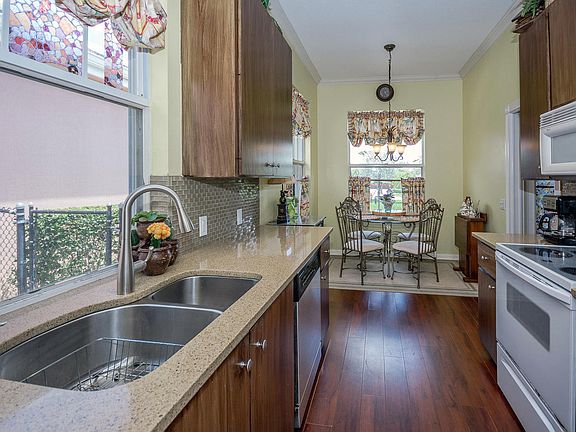 Recently extended Bedford,lovingly cared for, with SGD to oversized screened patio. French impact doors from Master suite to easy to care for tropical yard w sandy beach, fish pond w/waterfall, & fruit trees, very private. Many upgrades in this 3 bedroom,2 bath flexable floor plan w wood laminate floors t/out living area, quartz bath counters & kitchen, glass tile backsplash, custom drapes, light fixtures & fans. Newly installed, easy close storm shutters plus new hurricane screening on SGD for 100% protection. Centrall vac & recent A/C. Enjoy a serene Florida lifestyle in this 24 hr guard gated community w/heated pool & tennis conveniently near great shopping, restaurant row, Gardens Mall, beaches, golf, hospitals, I-95 & WPB airport.