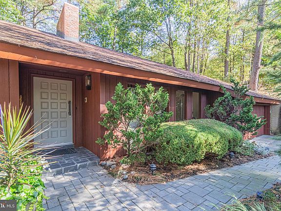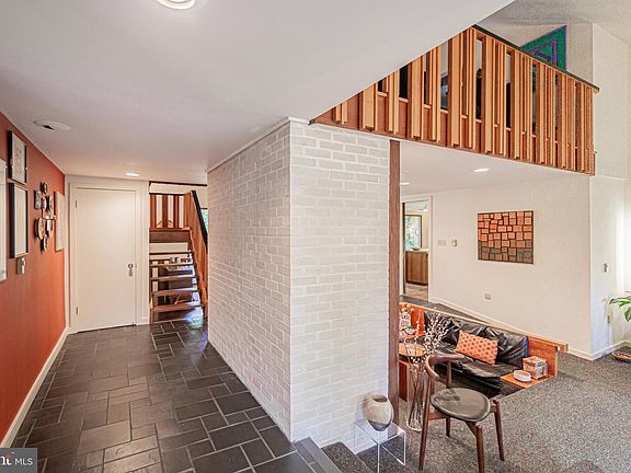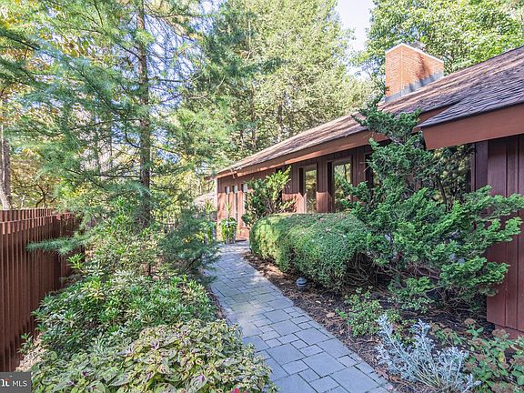 Mid-century modern nestled in the woods just 10 minutes from downtown Frederick. Spectacular open plan complete with conversation pit lined with leather sofas in front of a large fireplace! Many Frank Lloyd Wright inspired features include open mahogony staircase, high ceilings, walls of glass that bring nature indoors; original walnut kitchen cabinets with built-in bar and bar storage, island and table space kitchen with glass wall overlooking patio and deck with views of nature. The first floor master suite makes this home one level living possible and offers a sitting room with large windows, a side porch with railings that match the open staircase, custom built-in storage, walk-in closet, dressing area and spa bath. Up offers open family room landing, 2 additional bedrooms and a bath. The lower walk-out level offers plenty of storage and workshop/studio. Complete with 2 car garage and plenty of driveway parking. A rare intact mid-century modern masterpiece!