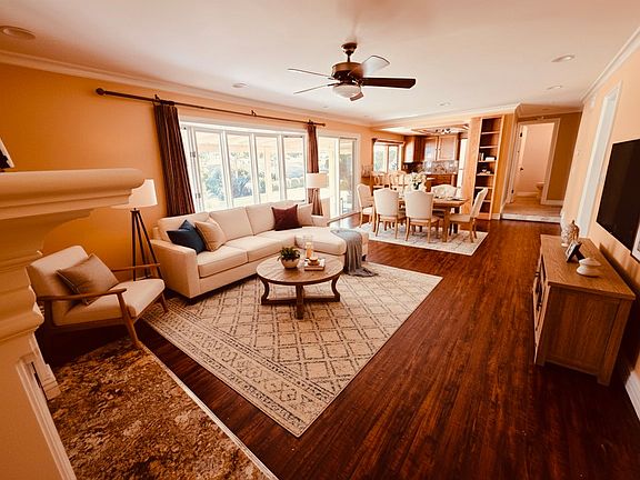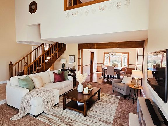 Step inside to find a bright and airy floor plan. The living room features vaulted ceilings and large windows that flood the space with natural light. The functional layout includes both a formal living room and a separate family room, providing flexibility for entertaining and daily life.