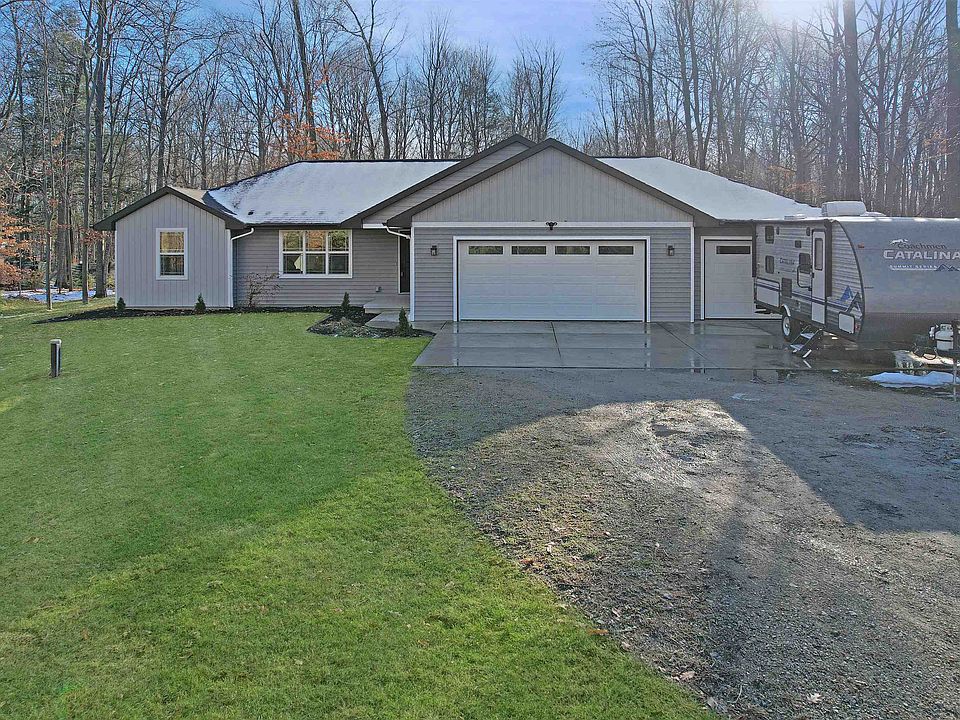 Built in 2017, this 3 bedroom, 2 bath ranch home with full basement with 8' ceilings, framed in ready to be finished off for additional living space and is plumbed for another bath, first floor laundry, primary bedroom with tray ceiling, spacious walk in closet and primary bath. Living room, full bath and 2 bedrooms offer newer luxury vinyl flooring, Kitchen with custom maple cabinets, stainless steel appliances, an island for additional prep space, coffee bar area, patio doors off dining area to the concrete patio with firepit that overlooks the parklike backyard, 3 car attached garage with storage area above, home is wired and ready for a/c. All this on 1.55 acres close to town.