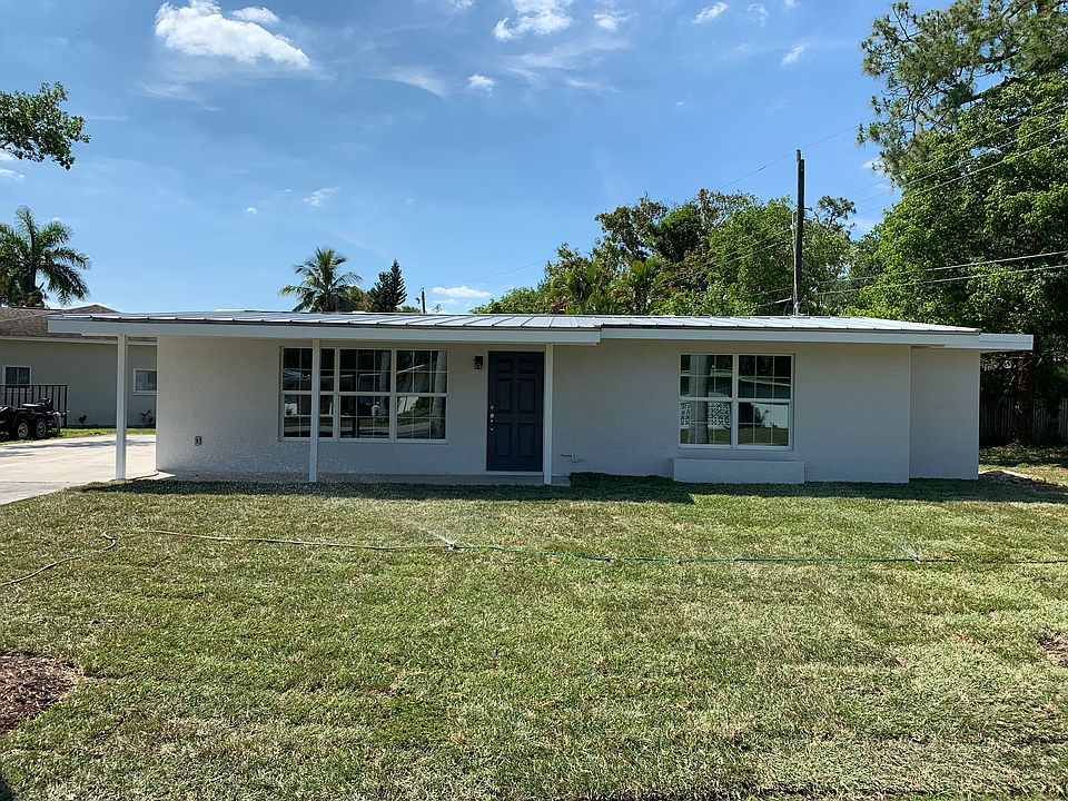 Adorable home sitting on a big corner lot with mature royal palms. This house is a complete new house! Every has been totally gutted and put back together with all new. This feels way bigger than the square footage appears. New Stainless steel appliances, vaulted ceiling, granite throughout even in the bathrooms, new floors, latest spray foam insulation, new metal roof, all new plumbing, all new sheetrock, New AC inside and out along with all new ducts, all new electrical, gorgeous bathrooms with the latest lighted mirrors, with all neutral colors, and fresh sod lay down. You won't find a better valued home. Buy now and never have to do anything for next 10 years plus.