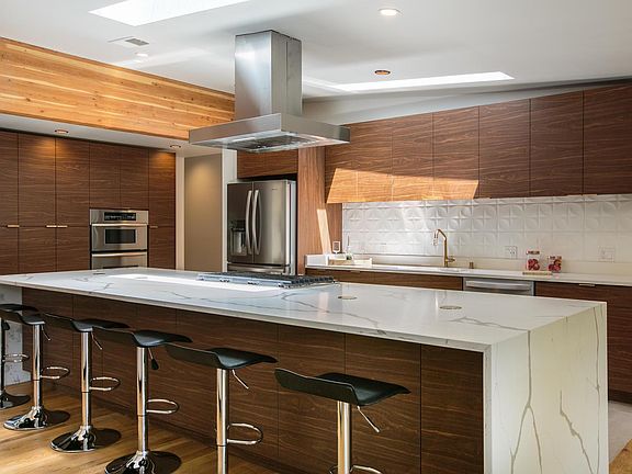 Unparalleled Japanese influenced Mid Century Modern conveniently located in the center of the City. Thoughtfully renovated to take advantage of the private lot and fully landscaped grounds. Natural light abounds w/large picture windows and skylights throughout. Enter through the private courtyard w/peaceful water feature into the grand entry way. Sunken formal LR with mid century 3d wall panels. Custom kitchen opens to living room & dining room with huge island featuring a double waterfall quartz countertop, double oven and 5 gas burner range. Dining & sitting area open to the lush backyard with double sliding glass doors making entertaining ideal! 2 spacious master suites each with sitting areas, walkin closets, big bthrms & doors to backyard. Water fea