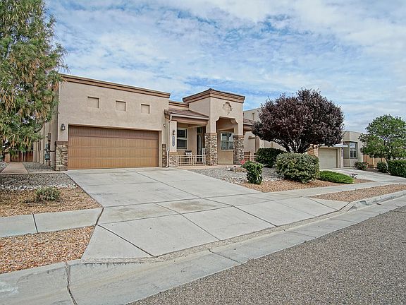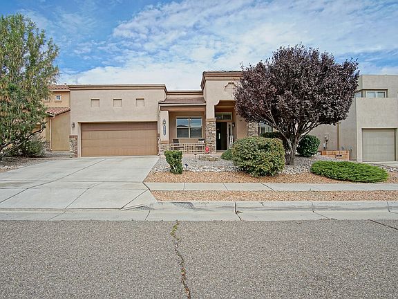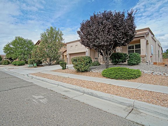Come take a tour of this beautiful 4-bedroom Home. Granite kitchen counters, Tankless water, Water softener. Primary bedroom with Custom vigas with Saltillo tile flooring, and a walk-in closet. High vaulted ceilings and refrigerated air. This home is immaculate and MOVE IN ready! Enjoy the cozy covered patio with a view of the Sandia. Gas connection for a bbq on those great New Mexico nights. HOA has club house and community pool. This is a must see on your list!