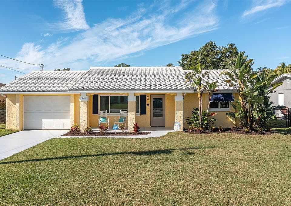 NEWLY PRICE IMPROVED! CAPTIVATING Gulf access FURNISHED newly remodeled 2 bedroom 2 bathroom home with a garage, dock, 8,000 LB boat lift, ON AN OPEN CANAL, and water views!! WOW! EASY ACCESS TO THE GULF with only one turn, and it’s a straight shot into the Gulf of Mexico!!! Bring your kayaks, canoes, boat, and jet skis for fun in the sun. From the water, you are SO close to Cow Key, Durney Key, Port Richey’s famous stilt houses, Werner Springs State Park, water-accessible restaurants, and just a short ride to Anclote Key, where everyone goes to hang out and scallop. BONUS is the house is pristine!!! Outside, fresh paint greets you, a charming porch for visits with friends, and magnificent great white birds of paradise in front. The fully fenced yard has gates on both sides. In the back, gorgeous bottle palms flank the entrance to the dock area, A boat lift keeps your boat out of the water, and an additional dock area allows space for more toys. The sea wall is in excellent condition! Inside, wood look tile adorns the entire home for style and easy maintenance. Natural light from the large windows pours into the family room. The remodeled kitchen anchors the open floor plan with shaker-style soft-close cabinets, granite counters, and stainless appliances. The casual dining area opens to the second living space with water views, and French doors off the back lead to the screened-in lanai overlooking the water. A full bath and designer shower are on the left. The two bedrooms have brand new furniture: one with twin beds and one with a queen. There is an additional remodeled bathroom with a tub. Newer vinyl windows all have white 2” blinds and window treatments. The current owners have seen tons of wildlife, including manatees from their dock! Fun trips out to the water and back create such good memories. The AC was replaced in 2013 with a new duct system and regular servicing. The roof was replaced with a barrel tile roof in 2014. The tile roof is in excellent shape and should last for MANY years to come. This is a golf cart-approved community with dedicated paths for ease of going to and from local venues. There is also a kayak launch and pet park in walking proximity. Park your vehicle in the attached garage, with plenty of space to have extra cars in the driveway. Your garage is large enough to house your boat trailer and a couple of kayaks with utilities and washer and dryer hookups. There is nothing to do here but bring your toothbrush! Everything is included (except for the boats, trailer, kayaks, and a few personal items). Close to downtown, restaurants, medical facilities, shopping, and more. Hudson Beach is just a few miles away. This house can also be a great investment opportunity for short-term vacation rentals. Call for your showing today!!! This is a true GEM! No HOA! Video Tour here - https://hd.pics/x806011