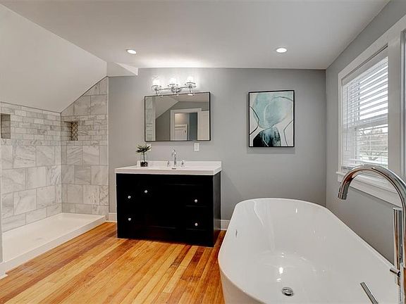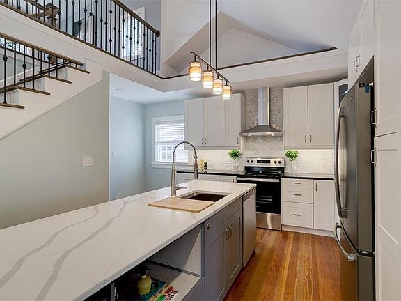You’ll be greeted with dark walnut hardwood floors, custom paint, crown molding, canned lighting, deep baseboards & fireplace with its repurposed original mantle. Enjoy an eat-in kitchen with vaulted ceilings, painted cabinets, brand new stainless steel appliances, deep farmhouse sink, reclaimed fir flooring & a designer quartz island (with complementary countertops).