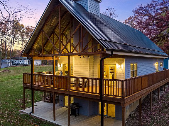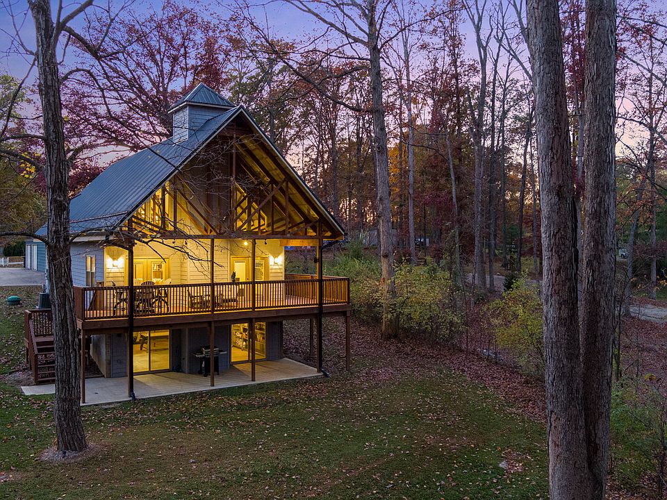 Gorgeous Contemporary A-Frame on Wooded Acre Lot @ Princes Lakes with lake rights. This Amish Custom Build is sure to turn your head. Open Concept Lower Level w/ Wood Beam Cathedral Ceiling. Fully applianced Kitchen w/ Granite Counter tops, Soft Close Cabinets. Great RM w/cozy Fireplace. Primary Suite on Main w/ WIC, Huge WI Tile Shower, & Double Vanity. Spiral Staircase to Loft Bed w/ En-Suite Bath. Large Rec RM in Walkout Basement. Outside Enjoy Sounds of Nature & the Beautiful Wooded View on the Wraparound Deck or Relax by the Outdoor Fire Pit. Tons of storage in the Oversized Detached Garage. 3 Bays, 2 Overhead Doors. This home is truly a rare find!