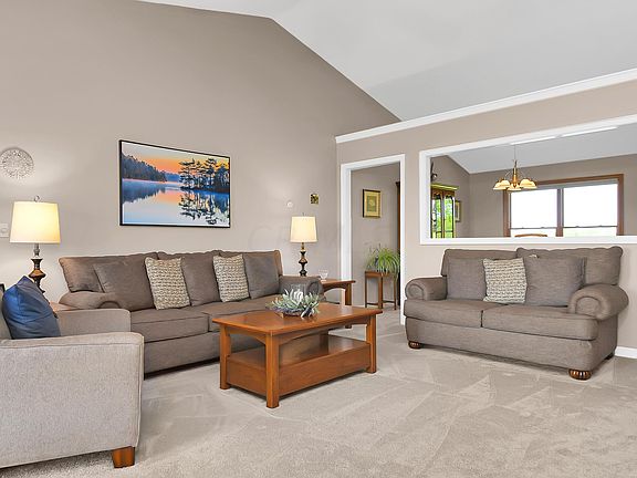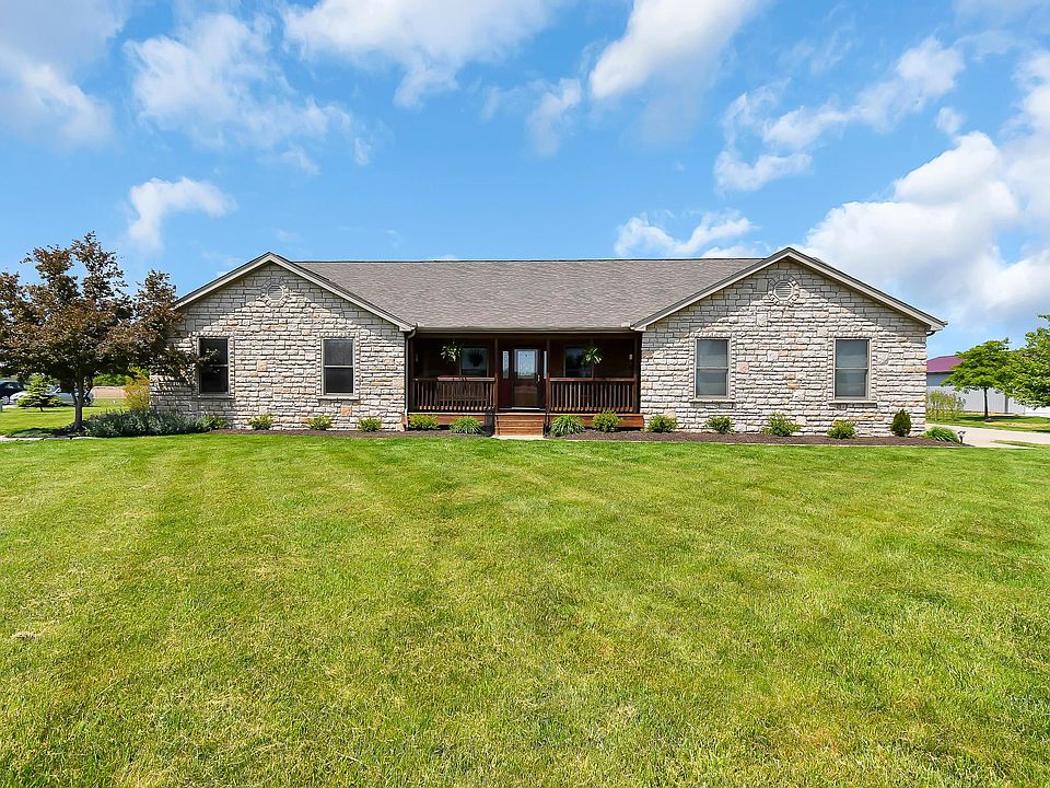 Outstanding County Ranch home situated on 2.26 acres w/ 5 car garage. Spacious vaulted Great Rm. / Dining Rm. combination perfect for entertaining w/ access to the covered front porch. Large Kitchen w/ stainless appliances & ceramic tile backsplash w/ undermount lighting. The Owners' Suite has an updated bathroom boasting an elevated double sink vanity w/ granite countertop, separate tub & shower with a walk in closet. All 3 baths feature granite countertops. 16'x16' screened porch offers access to the private rear patio and 24'x24' detached garage. The finished lower level offers 2 additional finished areas. Beautiful landscaping with a lot of nice trees. Whole house generator, new roof & carpet, freshly painted interior, water softener, 6 ceiling fans throughout, Pella windows.