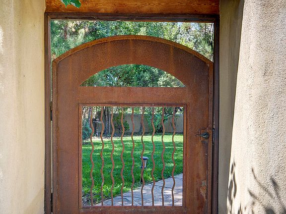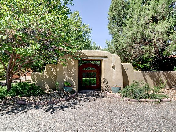 This stunning Nat Kaplan home in Los Ranchos has recently undergone a price improvement, making it an even more attractive option for buyers. Nestled in a private setting, this custom Adobe home offers a truly unique living experience. The property is surrounded by lush apple orchards, tall pine trees, and graceful cottonwood trees, creating a tranquil and picturesque environment. Upon entering the property, you'll be greeted by beautifully landscaped gardens and fragrant rose bushes, adding to the charm and beauty of the home. The 1.4-acre lot is well irrigated, ensuring the lushness of the gardens and providing a vibrant atmosphere. One of the highlights of this property is the sparkling pool, perfect for cooling off during the hot summer months.