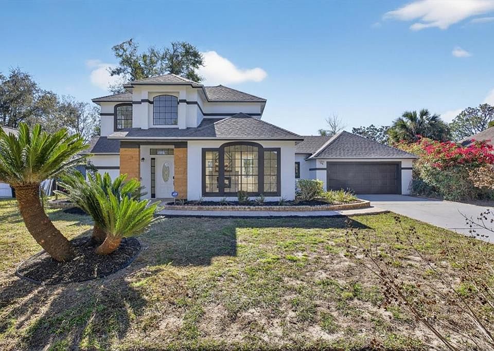 Welcome to this beautifully renovated 2-story modern farmhouse featuring 4 bedrooms, 2.5 bathrooms, and an expansive enclosed pool + hot tub oasis. Thoughtfully redesigned with tasteful finishes throughout, this home delivers privacy, functionality, and style. The downstairs layout centers around an open living concept with new flooring, modern lighting, and a bright farmhouse-inspired kitchen showcasing acacia wood countertops, upgraded cabinetry, stainless steel appliances, and bar seating perfect for gatherings. The living spaces blend seamlessly into the screened pool enclosure for effortless indoor/outdoor living. The primary master suite is privately located on the first floor, separate from the secondary bedrooms for a true retreat experience. It features a large walk-in closet, a beautifully updated bath, and direct access to the pool through a private exit — perfect for morning coffee, sunset dips, or spa nights. Upstairs, three additional bedrooms create a dedicated kids/guest wing, offering privacy and separation from the main living spaces. Enjoy year-round outdoor living in the enclosed pool & hot tub area, complete with a screened lanai ideal for bug-free dining and entertaining. Additional highlights include: • Brand new roof • Brand new A/C system • Fully updated bathrooms • Designer farmhouse details throughout • Oversized 2-car garage just under 1,000 sq ft — ideal for storage, workshop, gym, toys, etc. • Laundry room on main level • Fresh neutral palet
