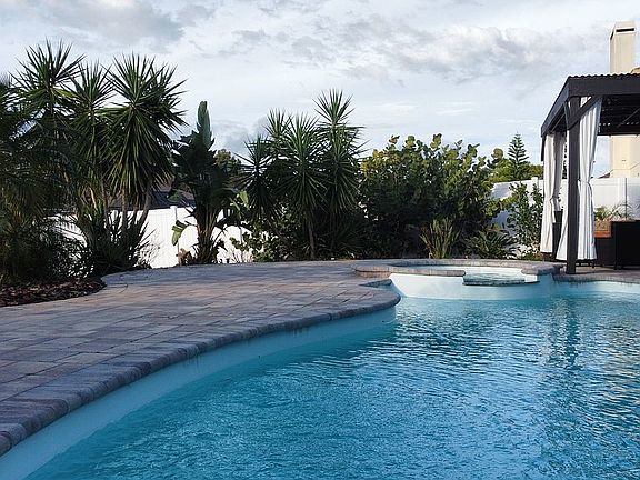 Prepare for paradise at 8619 Tenbridge Way in New Port Richey. This home is located in the highly sought after Waters Edge gated community. This spectacular home includes 5 bedrooms, 3 full bathrooms and a 3 car garage. The amazing heated saltwater pool and spa with waterfall feature are surrounded by a beautiful brick paver patio and lush tropical landscaping with up lighting. Patio also includes a custom covered pergola perfect for outdoor entertaining. Backyard also features vinyl fencing further providing additional privacy. Exterior of the home features stacked stone accents and stucco facade, reclaimed water irrigation, a large driveway, up lighting and wired security system. Upon entering the large double doors you are met with high vaulted ceiling in the large foyer, to the right is the formal dining room and family room area at the front of the house. Continuing on into the home you will find a large open floor plan beginning with a large kitchen complete with granite counters, island, stainless appliances and beautiful custom painted wood cabinets. The master bedroom has plenty of space for king size furniture and features two walk in closets. Master bathroom features double sinks, garden tub and large walk in shower, private water closet and newer light fixtures. Bedrooms 2 and 3 are located on the other side of the family room split by bathroom number two that contains a tub/shower. The 4th bedroom is perfect for related living OR guests coming to visit you in sunny Florida. This bedroom has a large walk in closet and a private bathroom that doubles as a pool bath with separate entrance to the patio. Most of the home is located on the first floor, however the 5th bedroom/bonus room is located on the second floor. This large room can be used a number of ways - previous owners have used this as bedroom, entertainment room, home gym, and home office. This home is designed around entertaining and family time. Waters Edge community features a large community pool with splash pad for small children. The clubhouse features on property management, a fitness center with cardio equipment as well as free weights and machines. There is also an entertainment room as well as pool table and ping pong table, plenty to do right at home! The low HOA includes access to all community amenities as well as trash service twice a week, cable TV, and internet!