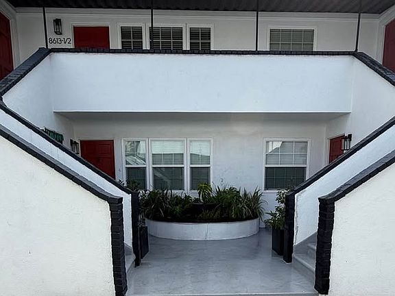Large windowsTrendy backsplashGlass-front cabinetsSidewalks and palm treesStainless steel appliancesRecessed lightingBuilt-in storage