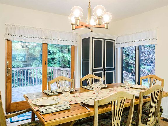 Lovely contemporary in excellent section 2 location. Spacious with soaring ceilings and hardwood floors and the comfort of central air. Large deck on level lot with mostly hard woods and access to trails. Layout of home allows for single level living or second floor master. Each bedroom has its own bath. Exciting, fun, and easy to own.