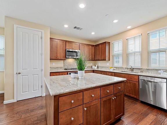 Do not miss this stunning better than new home centrally located for easy access to downtown and commute. Corner unit with two covered porches and WEST facing front door. Desirable floor-plan with 1 bedroom and 1 full bath and garage on first floor. Highly upgraded interior with stunning plank flooring, recessed lighting, window coverings and two tone paint. Chef style kitchen with large island, granite counters, stainless appliances, gas range, large pantry and upgraded cherry cabinetry with brushed nickel hardward. Second floor features a large great room with abundant light, 1/2 bath, laundry room, and large covered WEST facing balcony-perfect to sit and watch the sunsets and enjoy views of the community park. WASHER, DRYER AND REFRIGERTOR INCLUDED! Top floor features large primary suite, with custom barn door to en suite bath and walk-in closet, two additional bedrooms and full bath. Turn the key and just move-in!!!