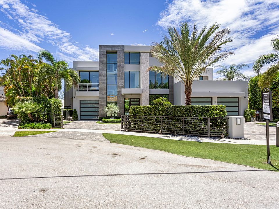 Sleek Modern 3-level Lake Rogers Isles deepwater estate sited on 125 +/- feet of waterfrontage, one off the point with rare Spanish River Park wooded views and originally built by JSB Builders. Light- filled estate with dramatic glass and steel floating staircase highlight with a soaring signature wall up the third floor opens to the great room with fireplace and window walls of glass overlooking the pool and waterway beyond. Gourmet kitchen island kitchen boasts suede finish stone countertops and glass subway tile backsplash, top of line appliance package and walk-in pantry. The dining room features a 1000 bottle glass wine vault to a professional bar. A Family room and adjacent Bedroom suite #5/Office completes this level. The second level provides a waterfront Primary Suite with dual baths and 3 additional bedrooms suites plus a theater/media room that can accommodate family and guests. The third level includes a Club Room with powder bath and outdoor rooftop sky deck with plush turf deck with putting green and hot tub all over with panoramic views. Outdoor entertaining features a mosaic tiled pool with sun-shelf, lanai with drop down screening, electric awning, fully equipped yacht dock with major 50k lb. lift and separate wave runner lift. Other amenities include a gated motor court, elevator, 3 bay garage with lift for a 4th, and home generator. Shown by appt only.