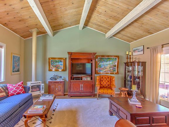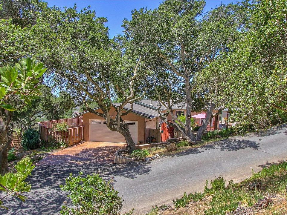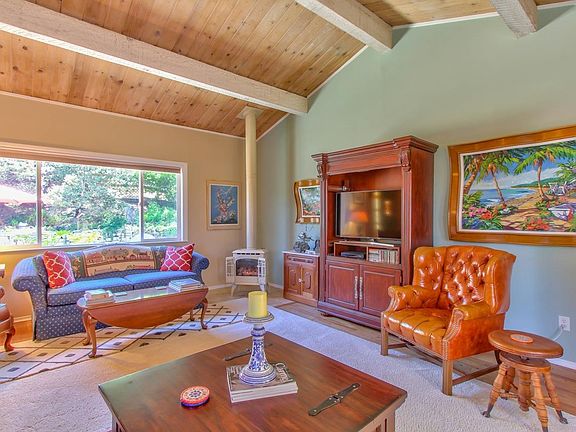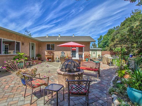 Serenity Found! Enter into a secret garden through a gated private courtyard complete with terraced walls, paver patio, mature drought tolerant landscape and outdoor fire pit. Desirable single level floor plan opens to living room with vaulted beamed ceilings, beautiful Oak hardwood flooring and cozy stove. Patio door leads to 800 sf deck with hot tub and canyon views. Galley kitchen with Travertine tile floors, granite countertops & energy efficient appliances. Breakfast nook in the kitchen opens to the courtyard patio to expand entertaining to the outdoors.1.35 acre parcel with double driveway offers lots of possibilities. Landscaped grounds are maintained by automatic irrigation system and a very organized California shed. Upgrades include double pane windows and slider doors, updated bathrooms, tankless water heater, water softener with reverse osmosis system, mirrored closet doors, exterior stucco finish. Low cost Pajaro Sunny Mesa water + underground utilities.