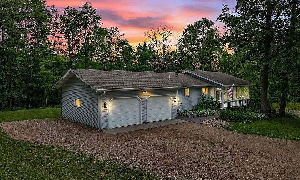 Nestled on a serene 16 acres just north of Rosholt, this beautifully updated 3 bed 2 bath home is the one you've been waiting for! Perfectly blending modern updates with rustic touches, you'll admire the thought and care taken in every aspect of the property. Upon arriving, a stamped concrete walkway leads you to the front screened porch, a perfect place to sip your morning coffee and enjoy the sounds of nature. Step inside and experience the gorgeous and open main living area featuring LVP flooring throughout. The kitchen is a chef's dream, equipped with stainless steel appliances, granite countertops, a stylish tile backsplash, and a custom live edge breakfast bar. The adjacent dinette and living room offer a relaxing atmosphere, highlighted by beamed ceilings, a cozy wood-burning fireplace, charming window nooks, and beautiful views of the surrounding natural landscape. Down the hall you'll find two main level bedrooms and a gorgeous bathroom with a custom tile tub surround, hard top vanity, and vessel sink. A spacious laundry room is also conveniently located on the main level.,Downstairs, the finished lower level boasts a ceramic tile floor, second wood burning fireplace, stone accent wall, and lower level walkout to the stamped concrete patio and 5 person hot tub! A third bedroom with egress window and full bathroom with a tiled shower surround creates a fully functional lower level living space. On the exterior of the home, the 2 car attached garage is insulated and heated, providing a comfortable space for storage and year round projects. The surrounding land offers endless possibilities for the nature enthusiast. Whether enjoying exceptional hunting opportunities, hiking, or simply relaxing in nature, this property provides an ideal and peaceful setting. Quiet country living doesn't have to be without its modern conveniences, high speed fiber internet is also available, ensuring seamless connectivity for work and entertainment. Per Seller Furnace and AC were updated in 2022, water heater in 2023, basement high efficiency wood stove in 2017. This home offers a unique blend of modern comfort, rustic charm, and outdoor possibilities. Properties like this are rare gems - schedule your showing today before it's gone!